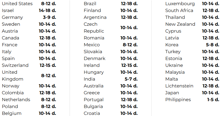 We usually take about 1–2 business days to process your order. After that, you can expect the following delivery times, depending on your country: